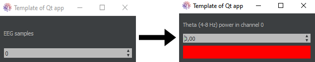 In this example, we will modify the PyQt5 template, which counts the received samples of an EEG signal, to implement a simple neurofeedback experiment that calculates EEG theta-band power in the first channel and displays the value using a color-based feedback. For simplicity, follow this tutorial to create a fake EEG signal first.