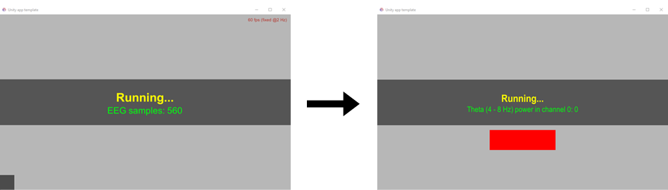 As we aim at offering the theta-band power as feedback, we need to get rid of the default graphical user interface (GUI) and customize it to display: (1) the absolute theta-band power value, and (2) the color we want to show as feedback. What we want to obtain is shown in the following figure.
