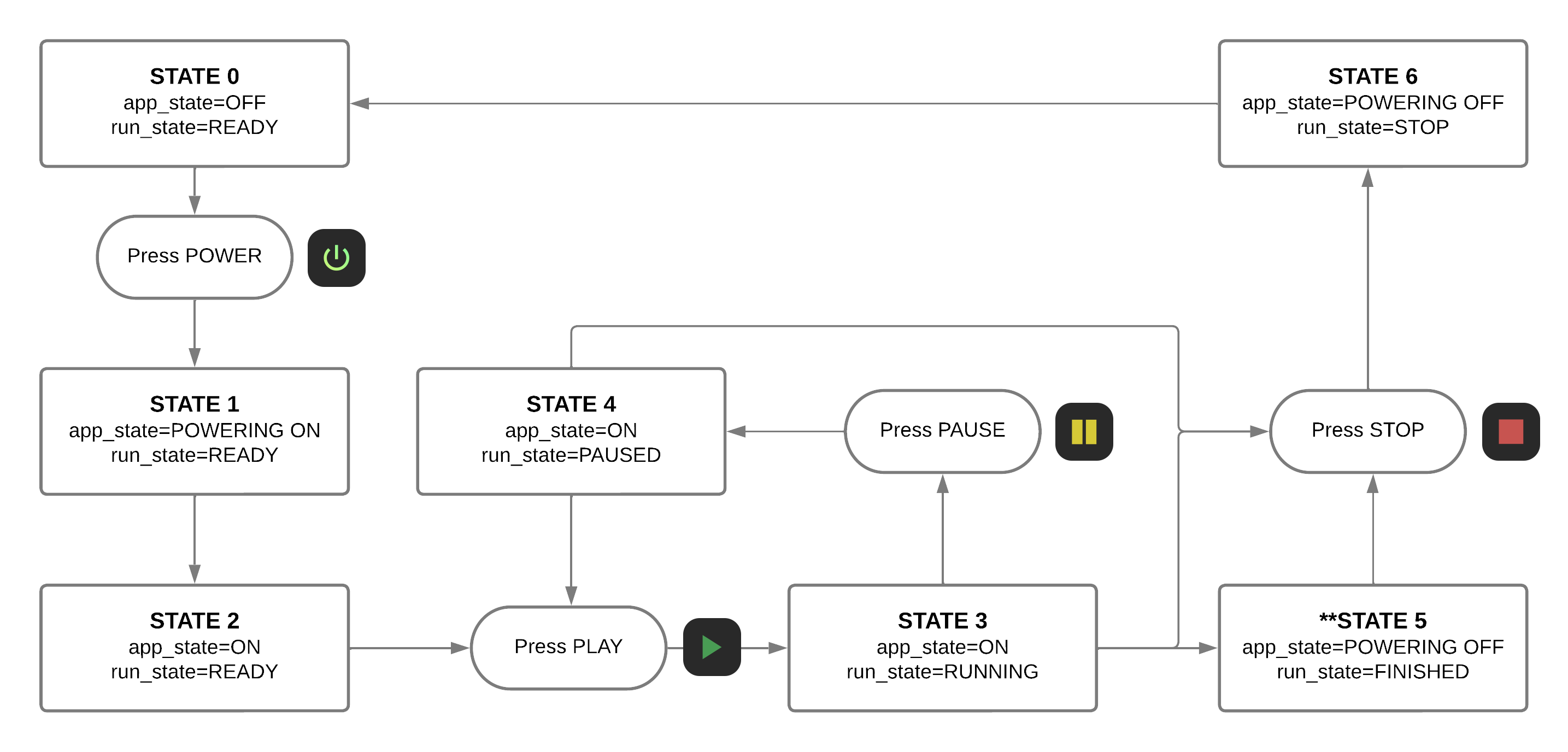 app_state, which represents the state of the app by changing among four possible values:OFF,POWERING ON,POWERING OFFandON. An app isOFFwhen it has not been launched yet. An app isONwhen is prepared to start a run. The remaining states are the transitions between theONandOFFstates.run_state, which represents the state of each run. This variable can take five possible self-explanatory values:READY,RUNNING,PAUSED,STOPandFINISHED.